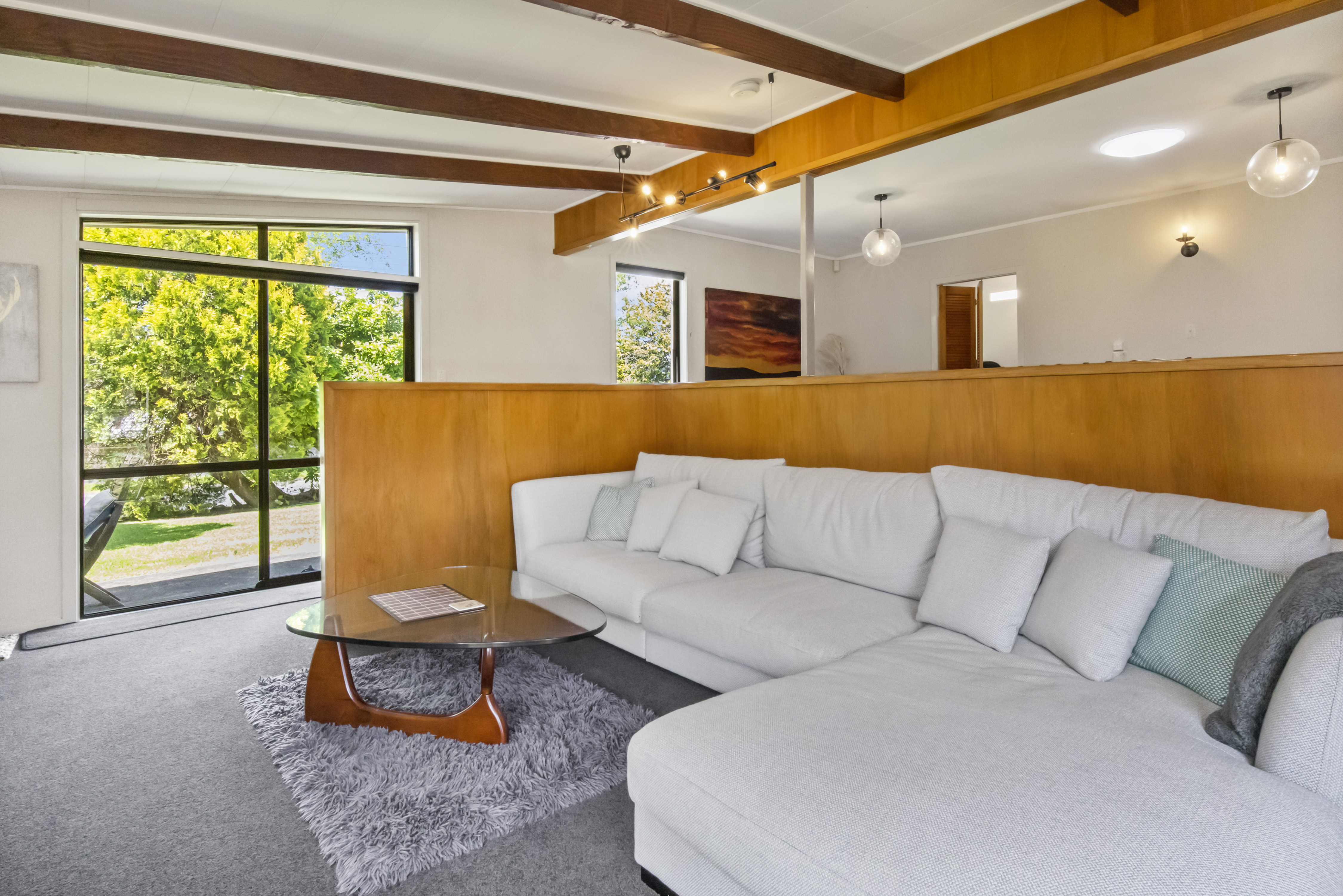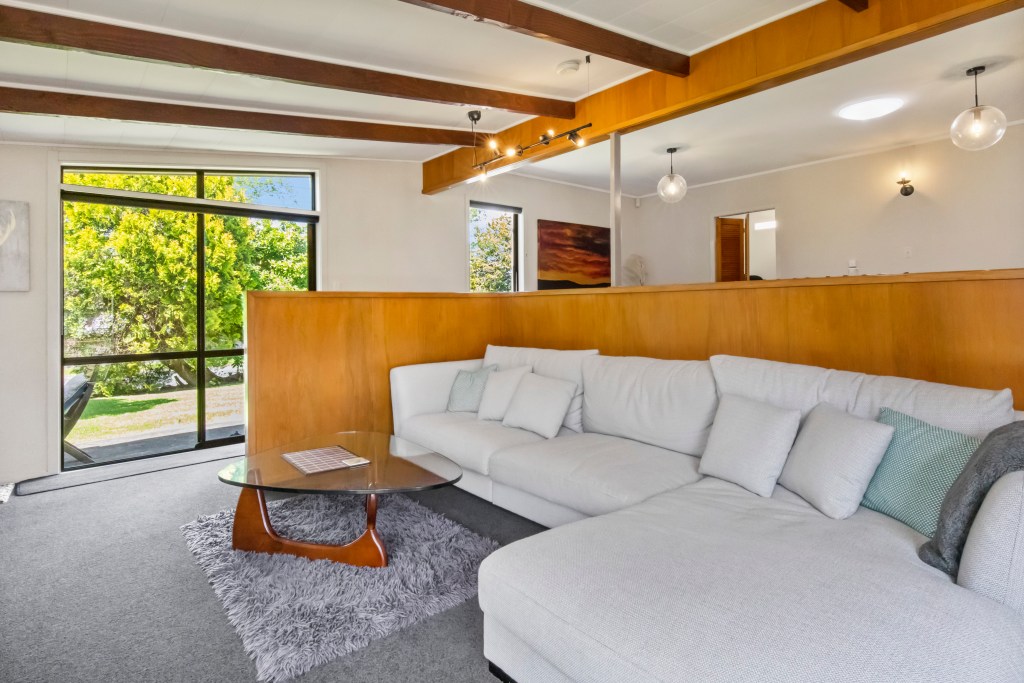 It has beautiful timber features throughout that really add character and a sense of warmth. The main living area has a timber feature wall, beautiful pendants and a relaxed vibe with big windows that overlook the garden and patio area letting the sun flood in.
