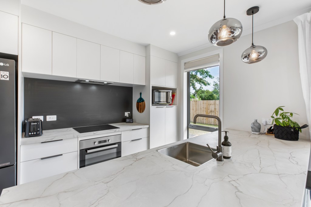 The kitchen has a breakfast bar and opens out nicely to the living area. Beautifully designed with monochromatic tones, it is a wonderful combination of style and functionality. The benchtop is simply divine, it has stunning pendants, fabulous appliances, and well thought out cabinetry for easy storage.