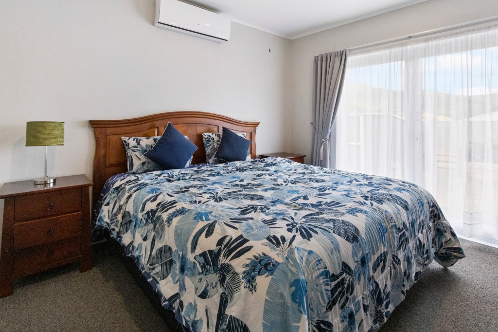 Well-presented and stylish, it has a beautiful light colour scheme that looks great and will easily suit your style. The dining room is particularly spacious, it has lovely green views through the corner window and a heat pump for year round comfort. The dining room takes you through to the gorgeous kitchen with eye-catching turquoise cabinetry, lots of natural light and modern appliances.