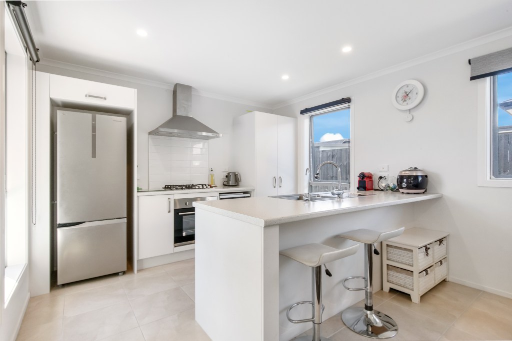 The open plan living area and kitchen is lovely and light, it feels stylish and contemporary, just right for family life. The kitchen has modern appliances, a gorgeous light bench top that doubles as a breakfast bar, and well thought-out cabinetry.