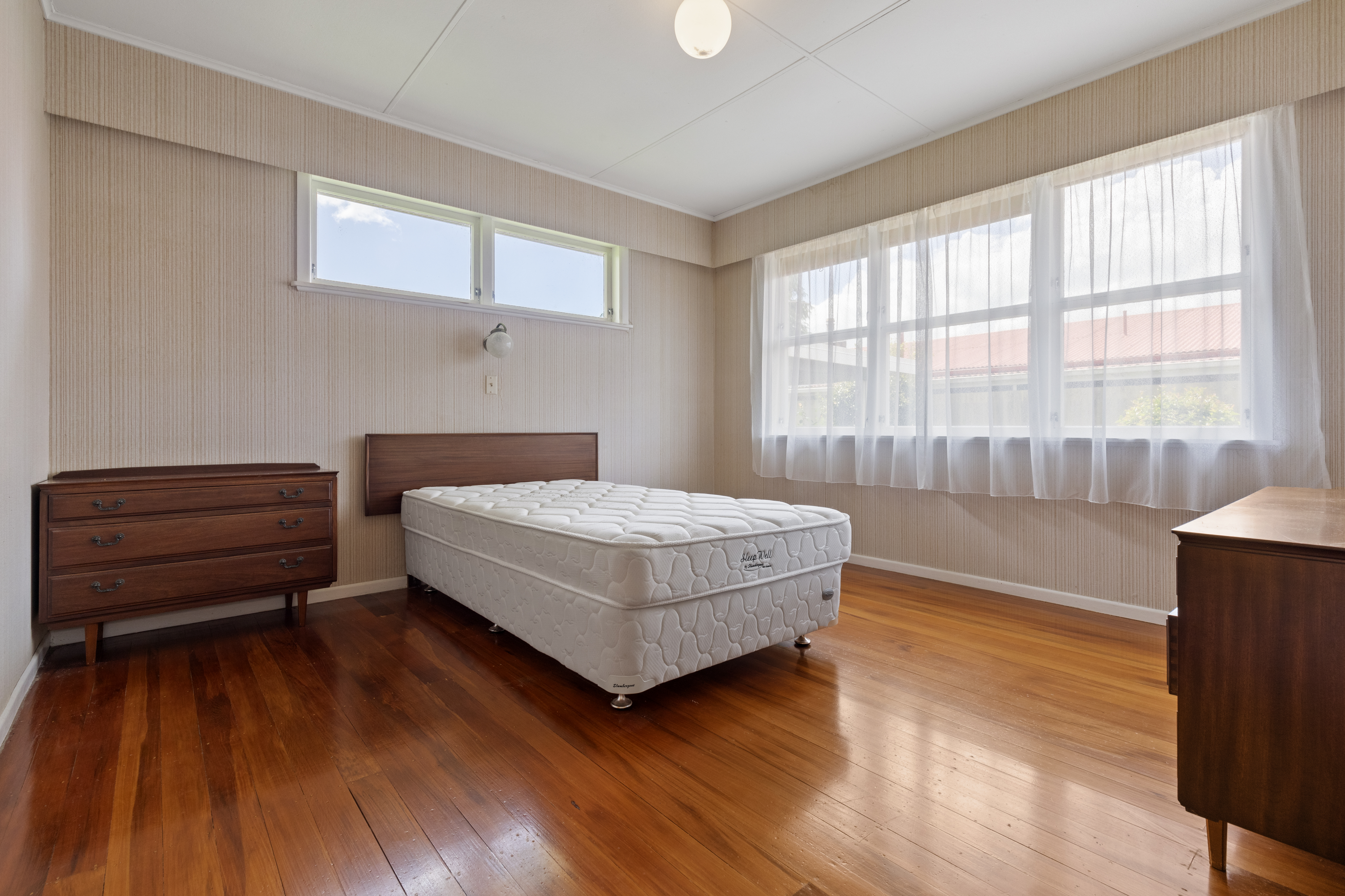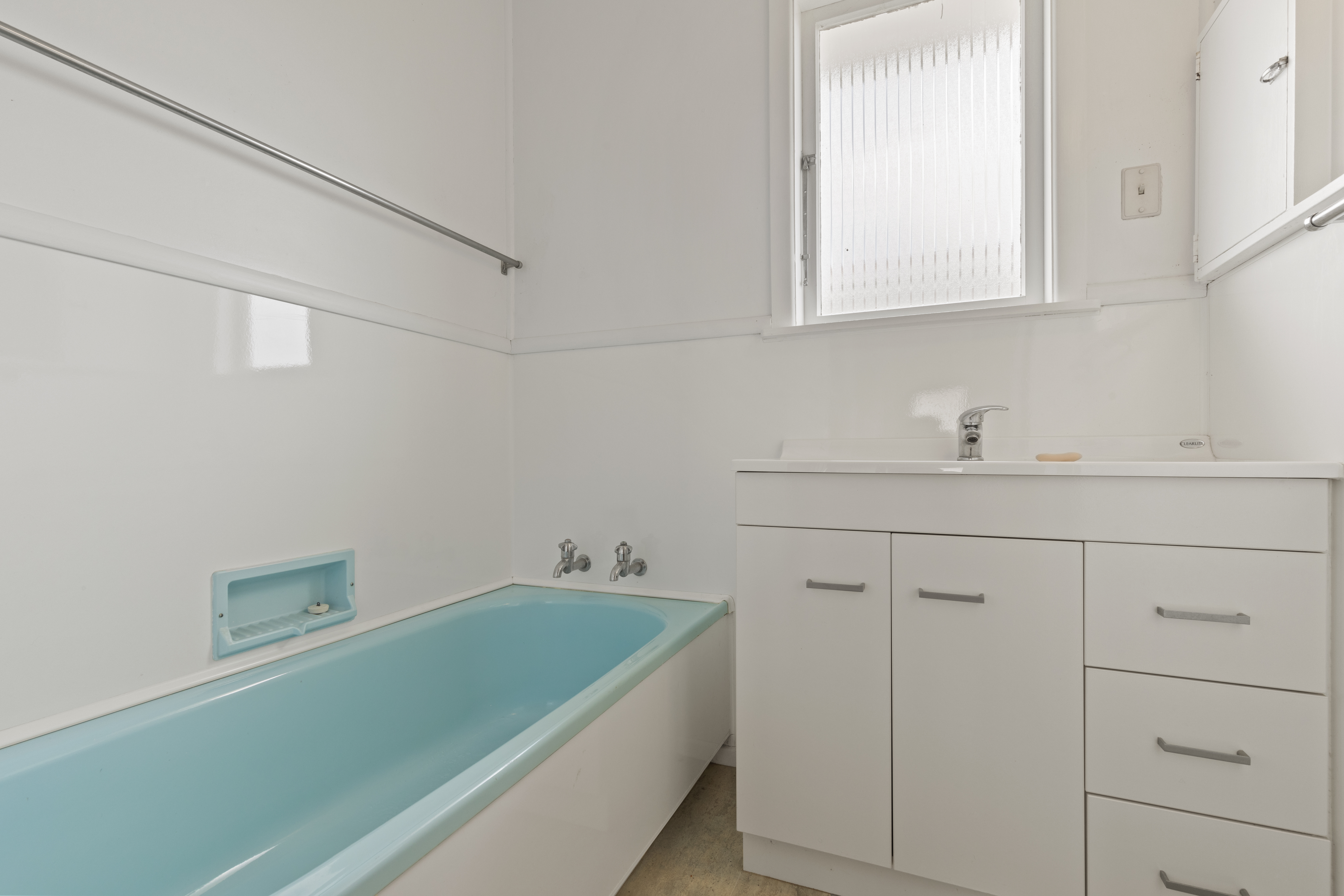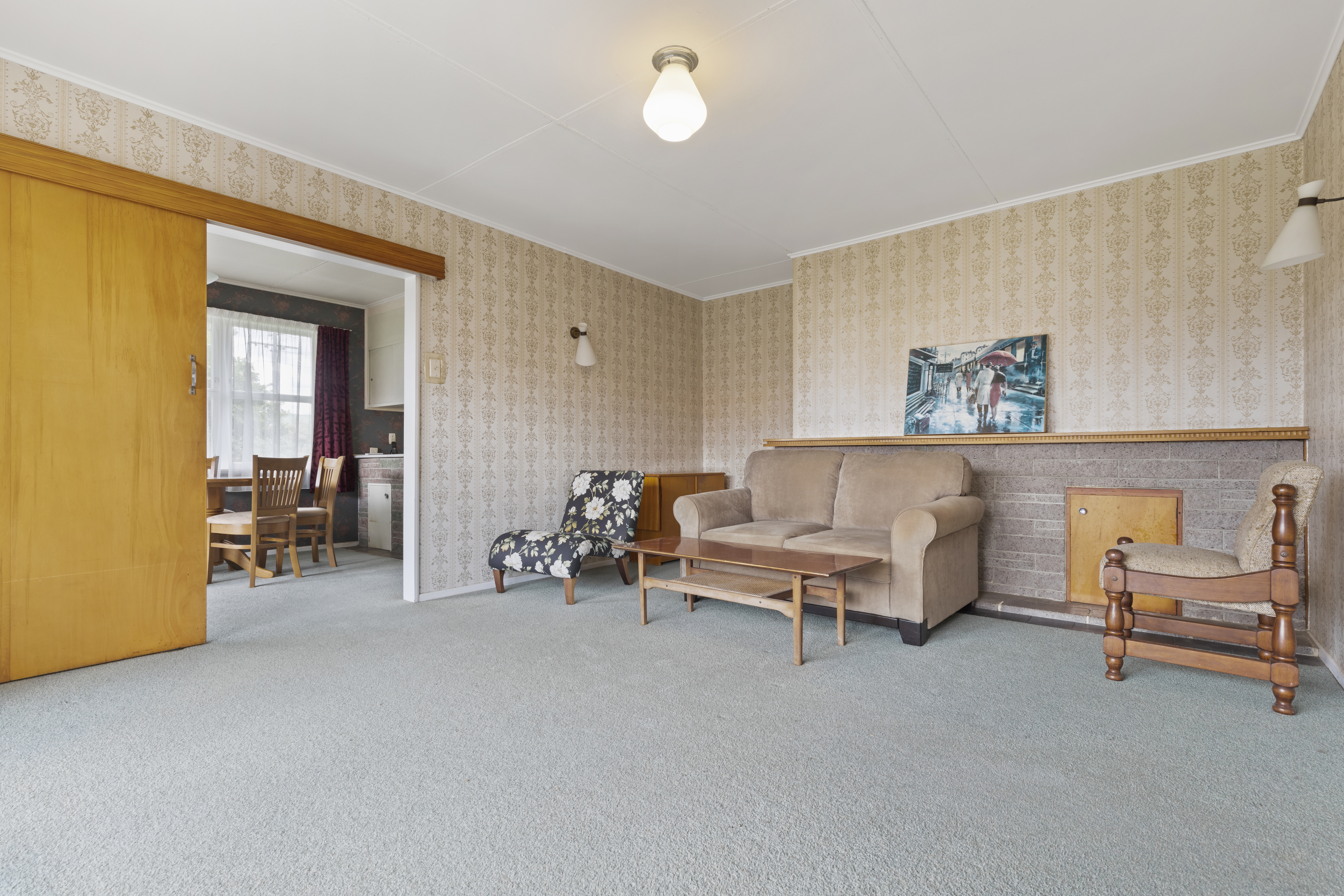 Enter off the covered patio area through the lovely french doors into the dining area. You’ll immediately notice the retro features of the neat original fire box and mid-century servery. Modern conveniences of a heat pump installed will keep you comfortable all year round. Pop through into the spacious kitchen, with its plethora of original cabinetry, you’ll have space for all your kitchen essentials.