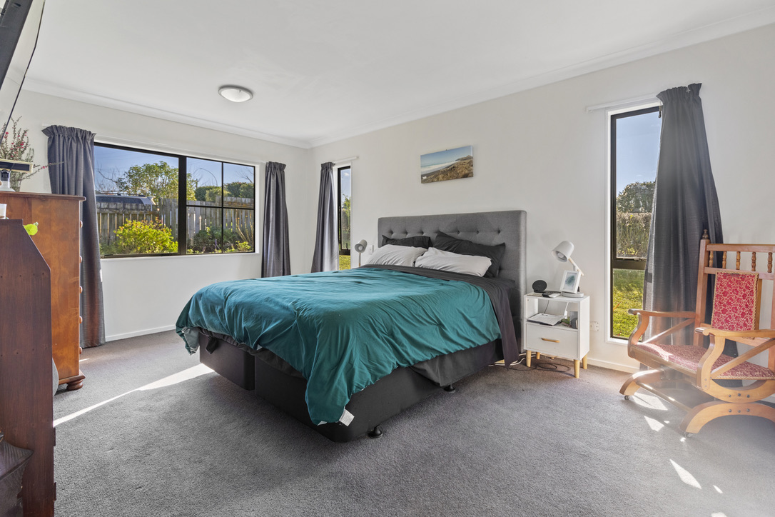 The lounge is warm and welcoming with a real sense of home, it has a heat pump to keep you warm in winter and cool in summer, and carpet for comfort. It flows nicely out to the deck, and there’s a sunny dining area as well with a gorgeous leafy green outlook.