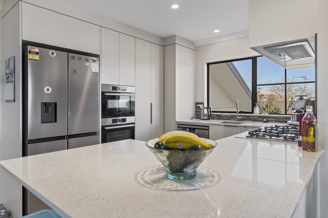 Lovely and modern, the kitchen has a gorgeous stone benchtop, stylish floor to ceiling cabinetry and modern appliances. It’s lovely and open with a beautiful white on white colour scheme, gas hobs and a large window that increases the feeling of space.