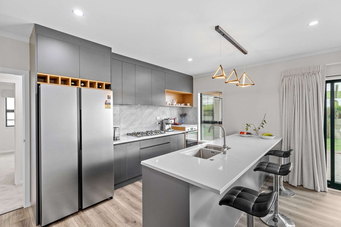 The heart of the home is its very modern open-plan kitchen with eye-catching pendant feature lights, sleek handle-free cabinetry, and a large breakfast bar. Equipped with quality appliances, this kitchen doesn’t just cater to culinary needs; it invites creativity and connection, making every meal a special occasion.