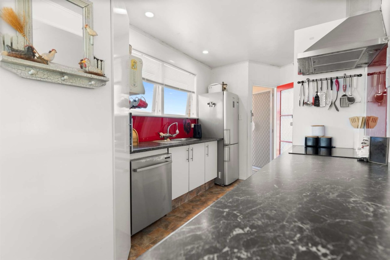 A gorgeous barn slider takes you through to the galley style kitchen, a lovely modern space where you can whip up your favourite family meals. It has a great aesthetic, with crisp cabinetry, a dark benchtop and a fabulous red splashback.