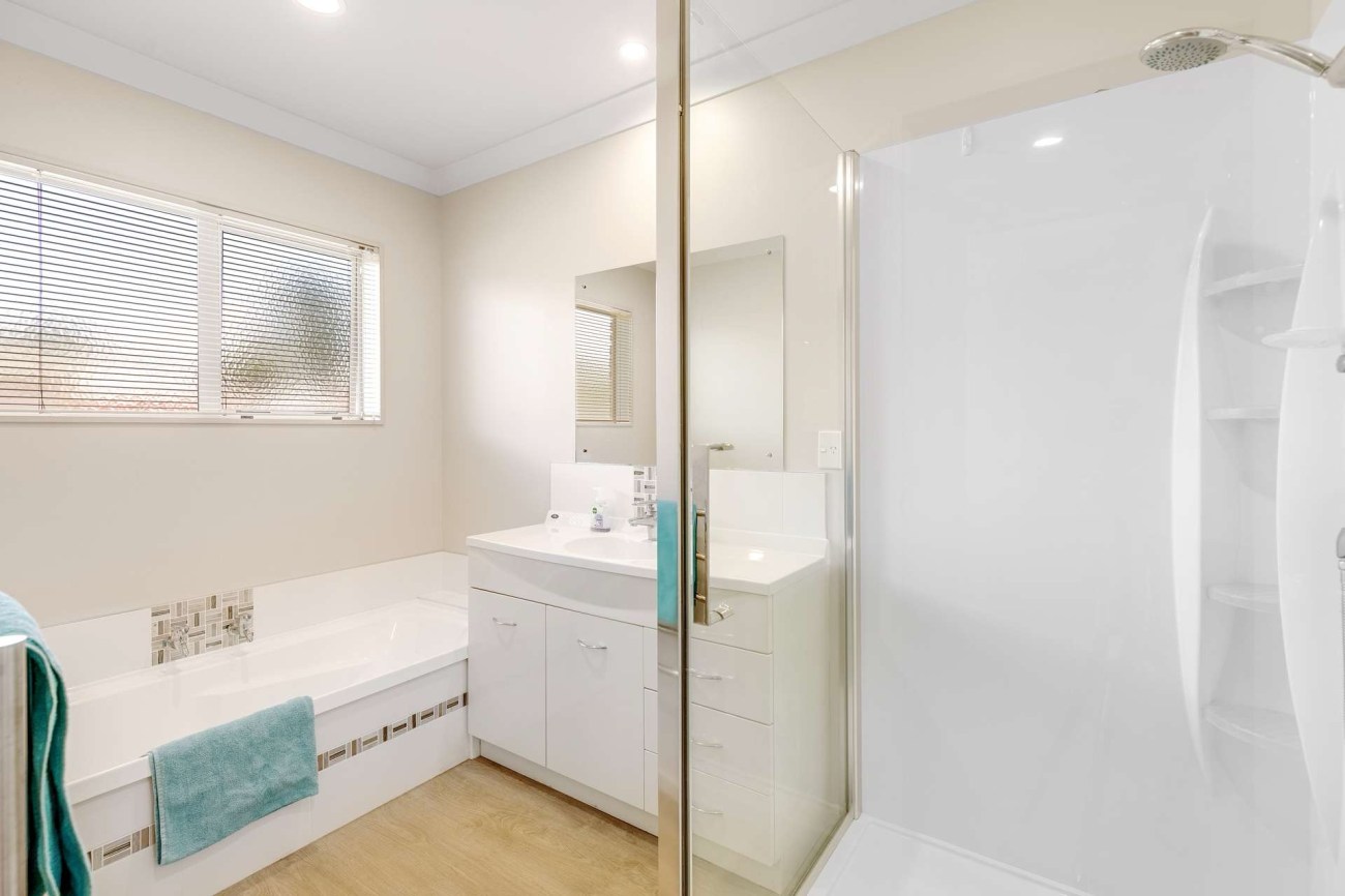 The ensuite bathroom is modern, featuring a shower, and vanity. The home also has a family bathroom with tub and a separate toilet.