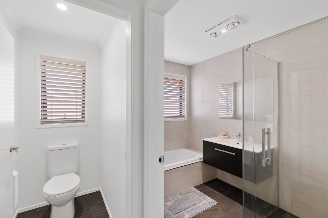 The ensuite bathroom is modern, featuring a shower, and vanity. The home also has a family bathroom with tub and a separate toilet.